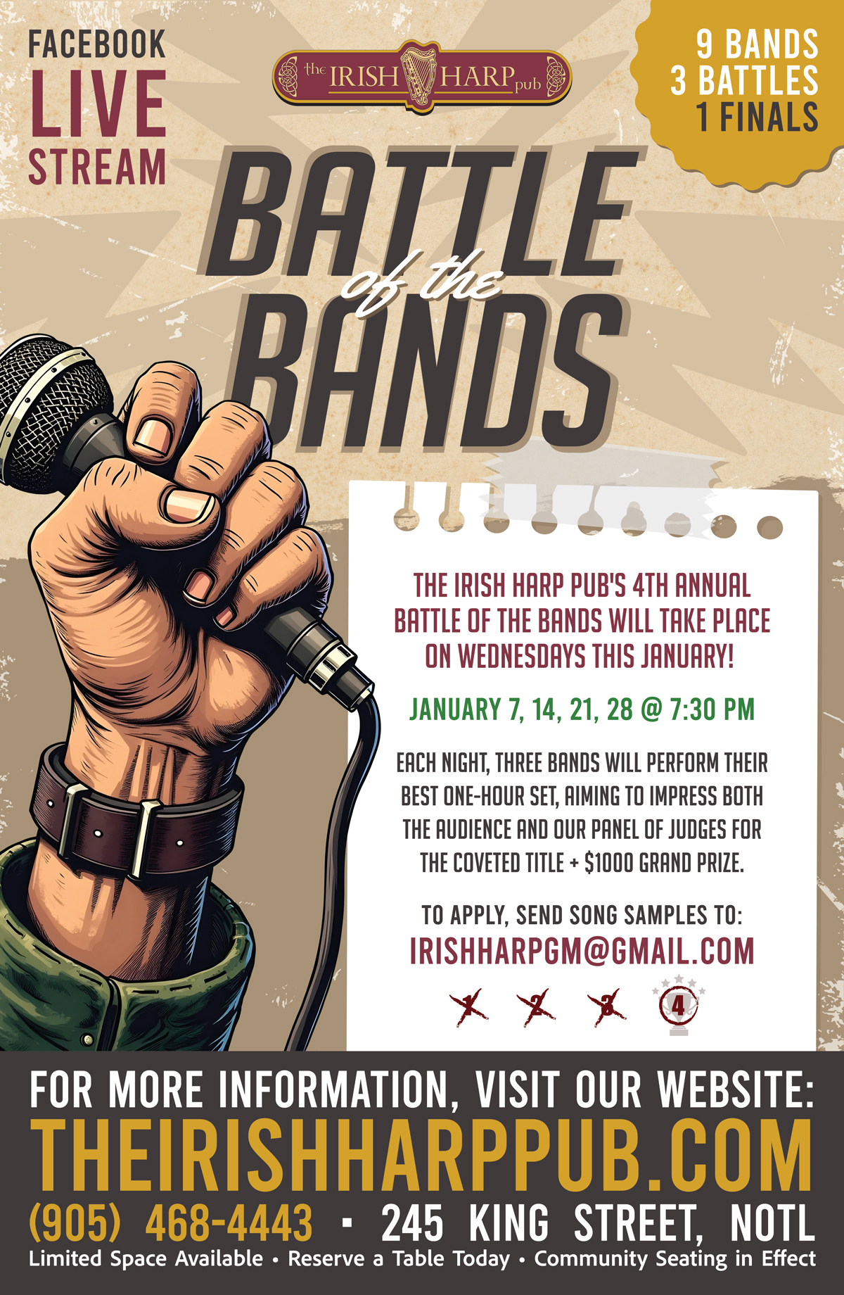 This is your chance to make your mark and perform at one of the Niagara Region’s hottest entertainment destinations. Space is limited—apply now! Email irishharpgm@gmail.com with pictures, videos, and music links.