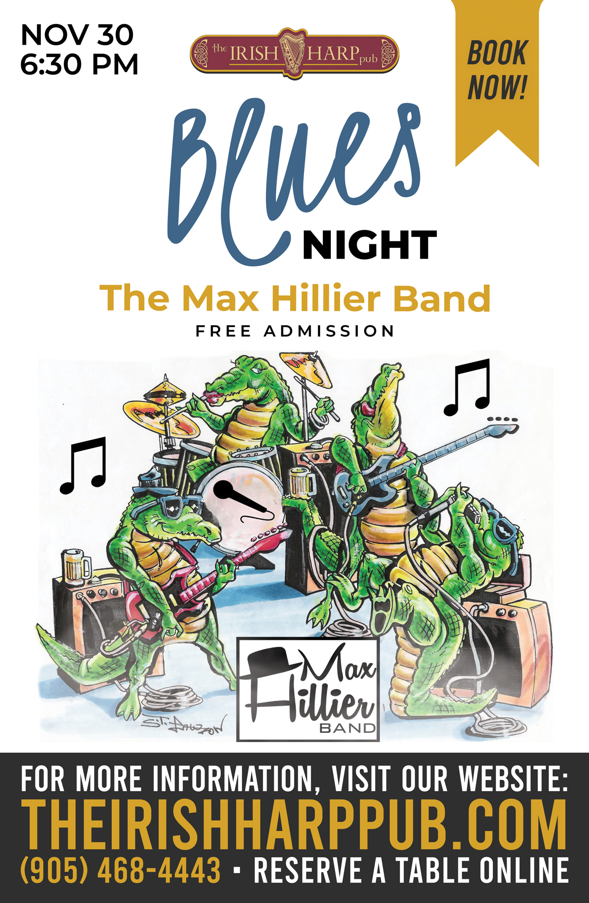 Featuring the Max Hillier Band, who deliver a full-on blues/rock party at every show—engaging the crowd with toe-tapping cover tunes that get everyone up and dancing, blending raw energy with irresistible grooves for an electrifying evening of music.