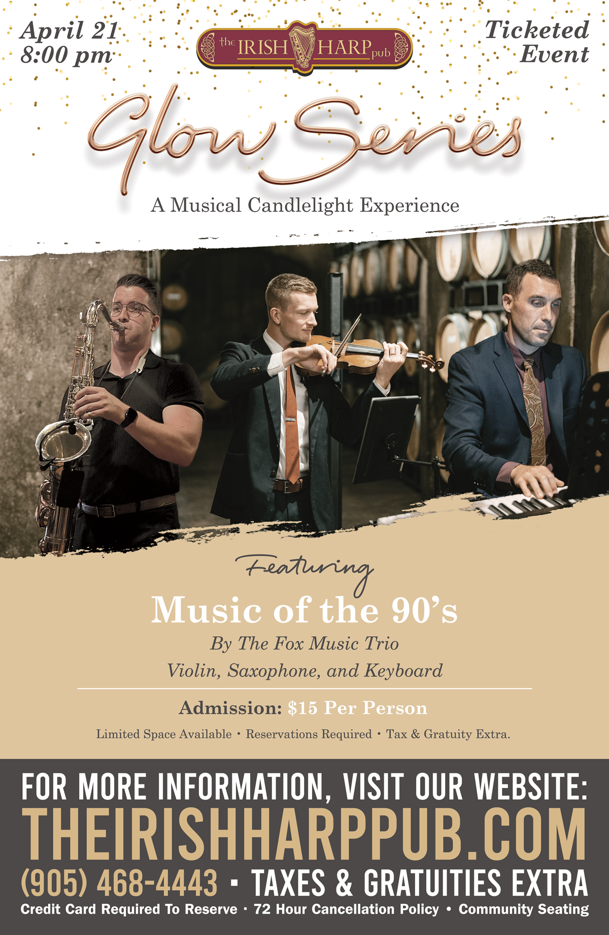 Join us at The Irish Harp Pub for our GLOW Series – A Musical Candlelight Experience, featuring a night of 90s hit music that defined the era. Beginning at 8pm, the room is set with the soft glow of 1000 candles, creating a warm backdrop for an evening of live performance. Our full menu will be available throughout.