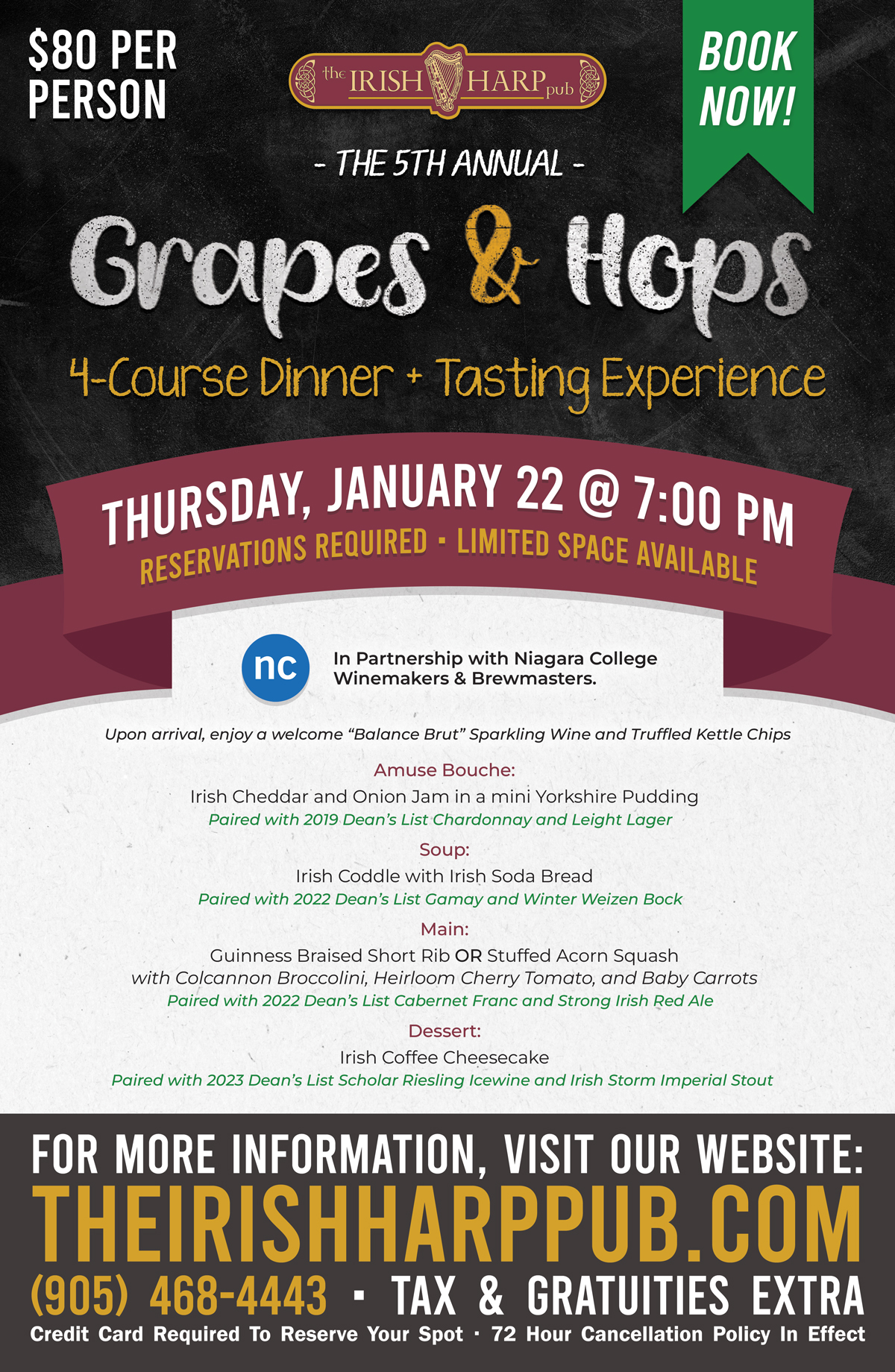 We’re excited to welcome you to our 5th Annual Grapes & Hops Tasting Experience, presented in partnership with the talented Brew Masters and Winemakers of Niagara College.