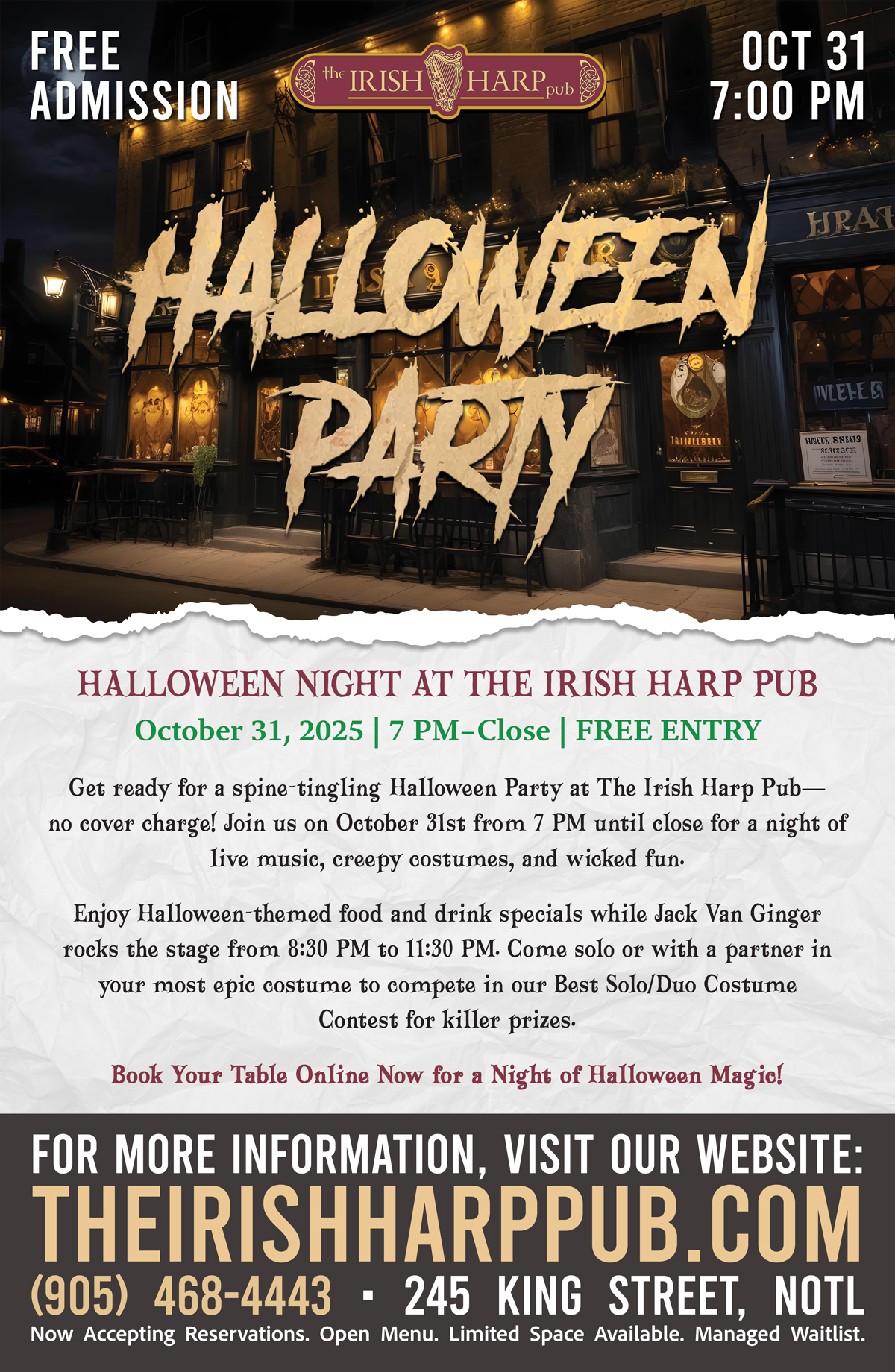 Join us for a wickedly fun Halloween Bash at The Irish Harp Pub on October 31st, starting at 7 PM and going until close—free entry! No cover charge, just come ready for a night of spooky vibes, delicious food, and killer drinks. Book your table online now to secure your spot for this haunting celebration!