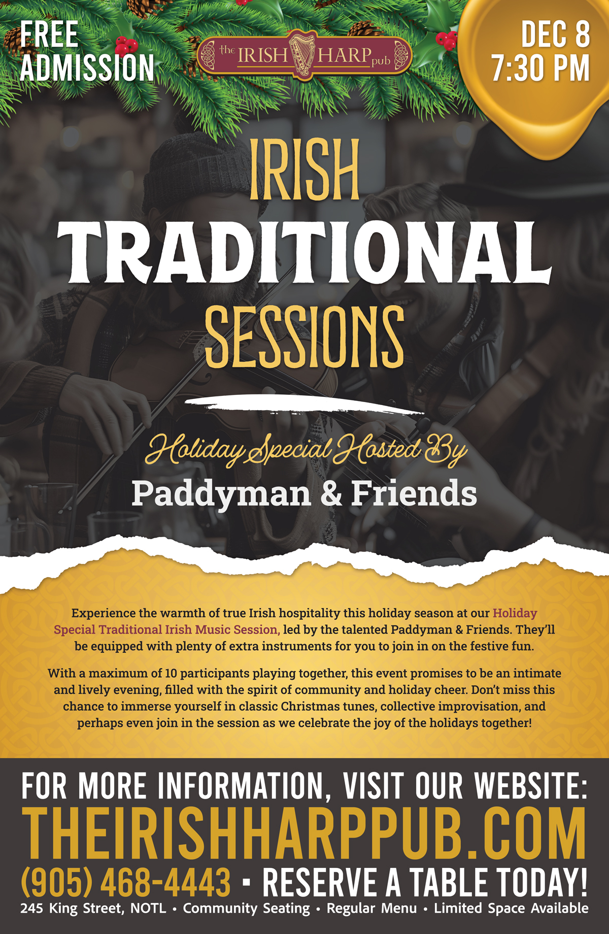 Experience the warmth of true Irish hospitality this holiday season at our Holiday Special Traditional Irish Music Session, led by the talented Paddyman & Friends. They’ll be equipped with plenty of extra instruments for you to join in on the festive fun.