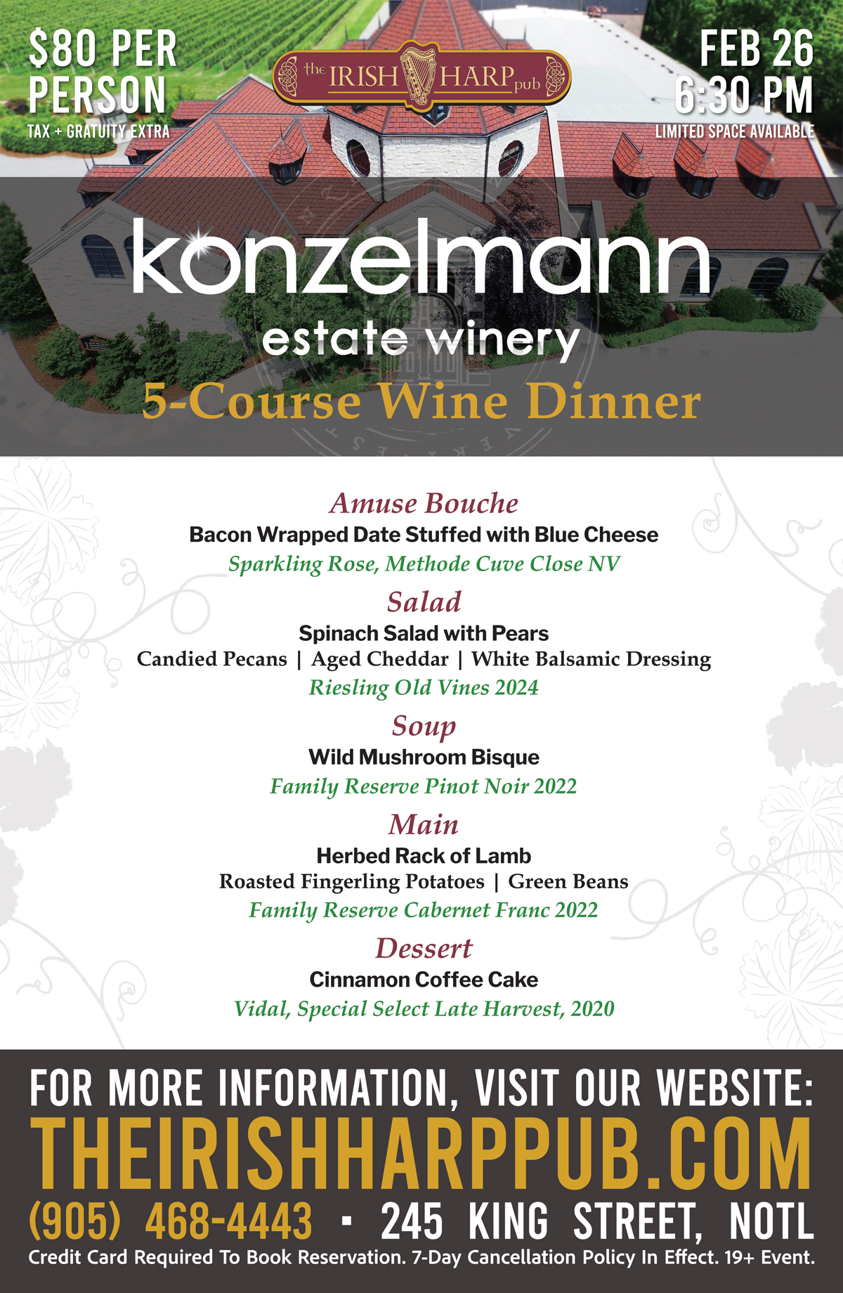 Join us at The Irish Harp Pub for a 5-Course Konzelmann Wine Dinner, an evening dedicated to thoughtful pairings, local craft, and relaxed hospitality.