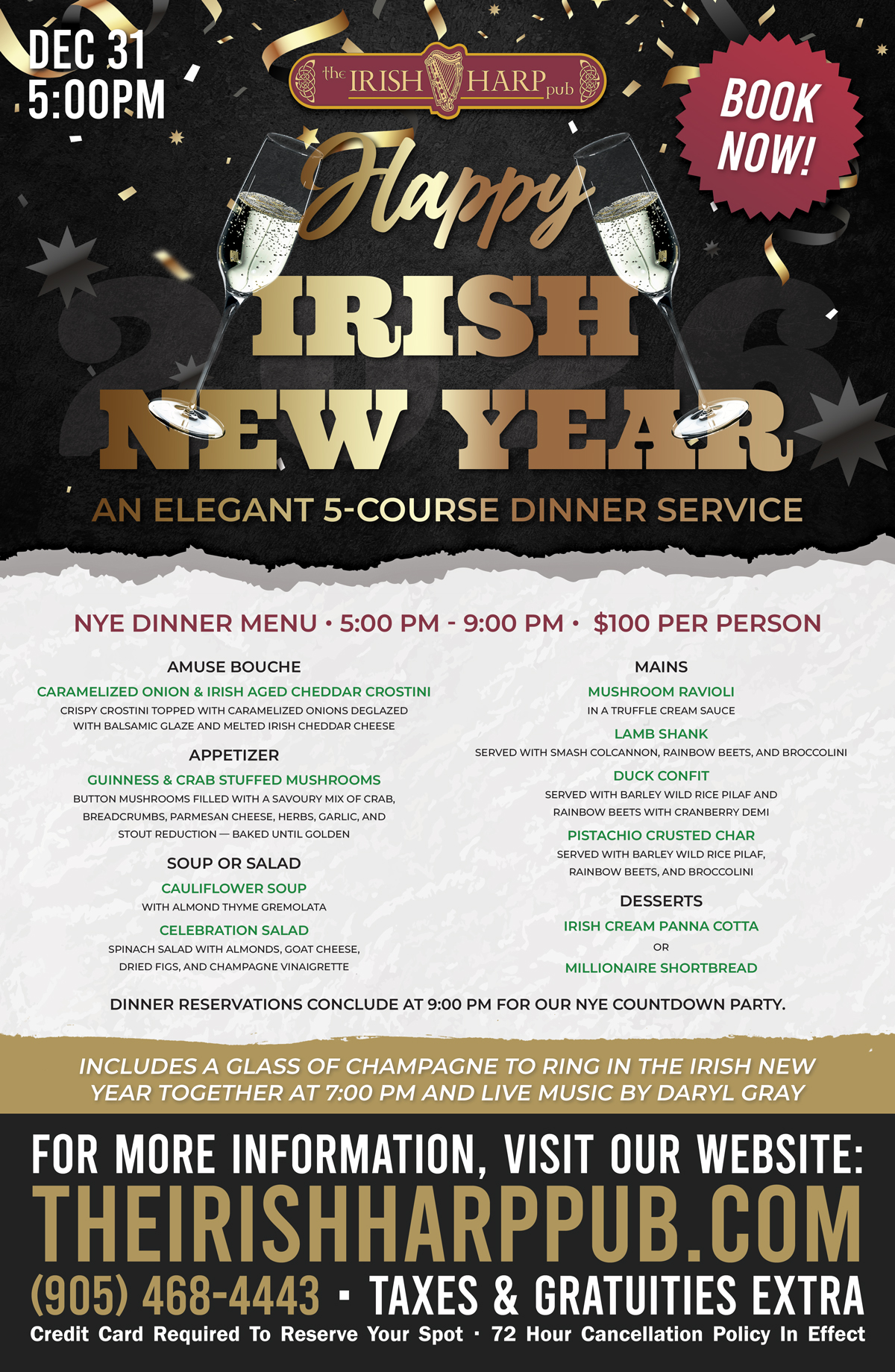 This is your opportunity to start the year in good spirits, surrounded by quality food, music, and company in a spot that feels like home. We look forward to sharing the evening with you at The Irish Harp Pub—see you there!