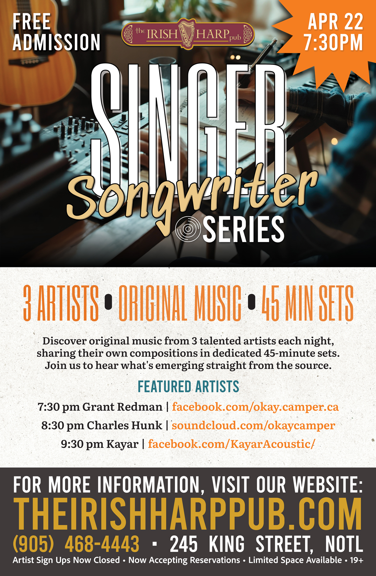 Join us at The Irish Harp Pub for our Singer Songwriter Series—a relaxed evening dedicated to original live music from local talent.