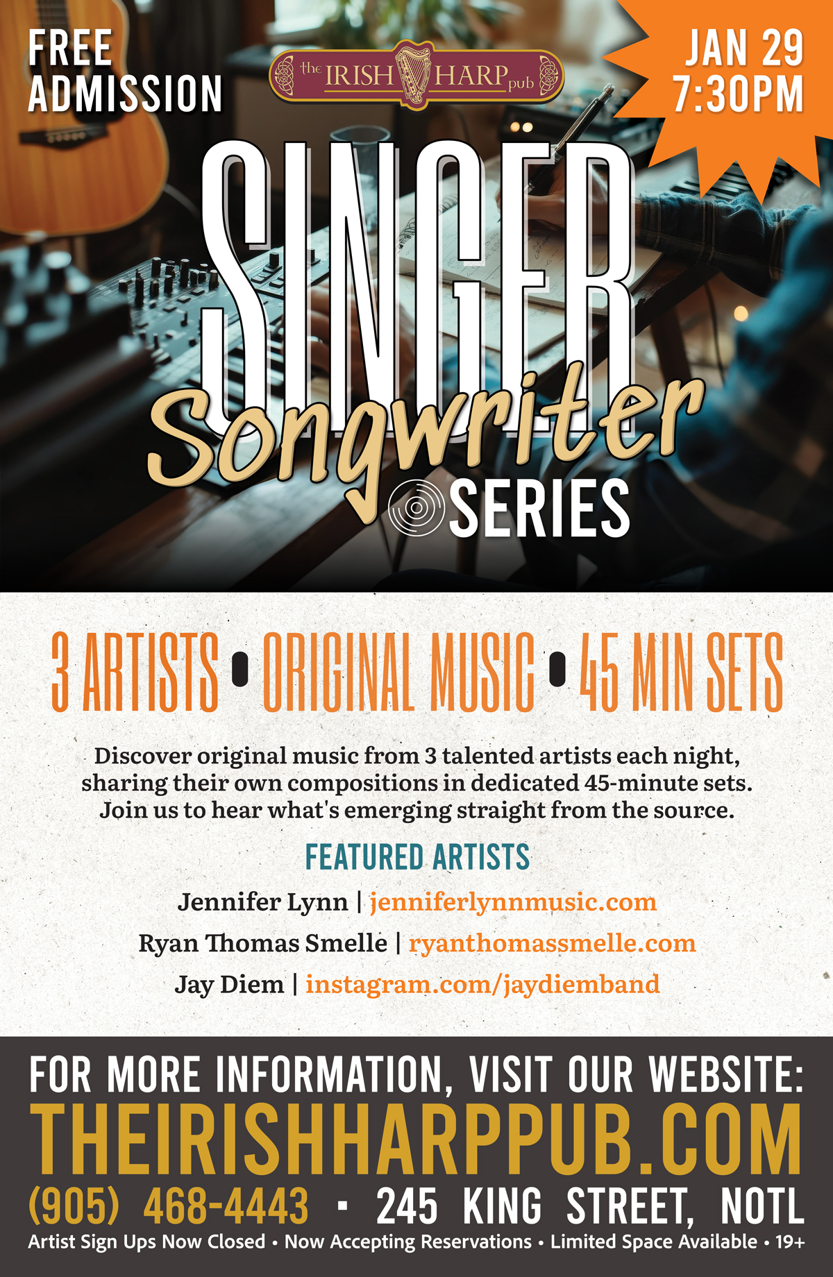 Join us at The Irish Harp Pub for our Singer Songwriter Series—a relaxed evening dedicated to original music from local talent.