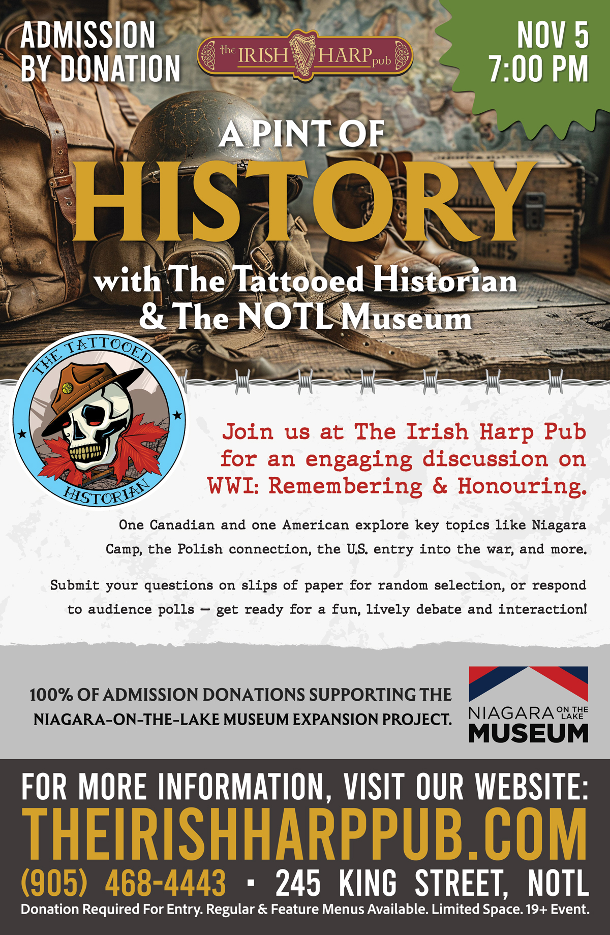 This event is proudly presented in collaboration with The Tattooed Historian, the NOTL Museum, and The Irish Harp. We look forward to welcoming you for an enriching and memorable gathering.