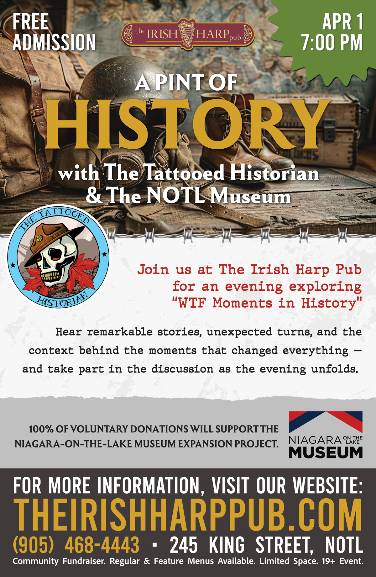 Join us at The Irish Harp Pub for another engaging evening of A Pint of History, presented in collaboration with The Tattooed Historian and the Niagara-on-the-Lake Museum.